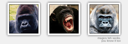 1. you are not teh secks. 2.how did you manage to switch from a gorialla to monkey? from bigger to smaller? |